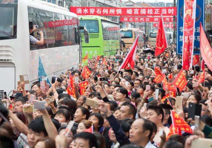 ▲2017年6月5日,在六安市毛坦厂中学外,考生家长和当地居民为考生送行。(新华社记者 郭晨 摄)