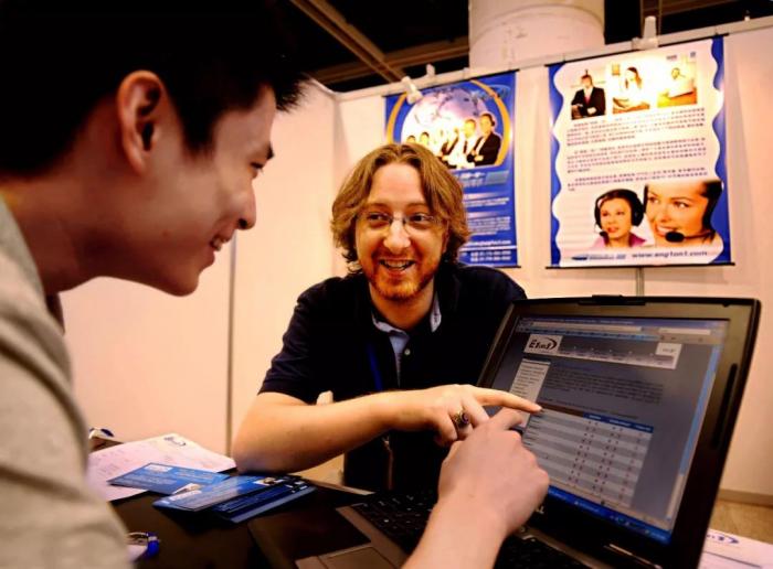 ▲2008年6月29日,一位浙江考生在向美国教师帕特里克·德莱尼(右)咨询美国大学招生情况。出国留学人数正快速增长。(新华社记者 谭进 摄)