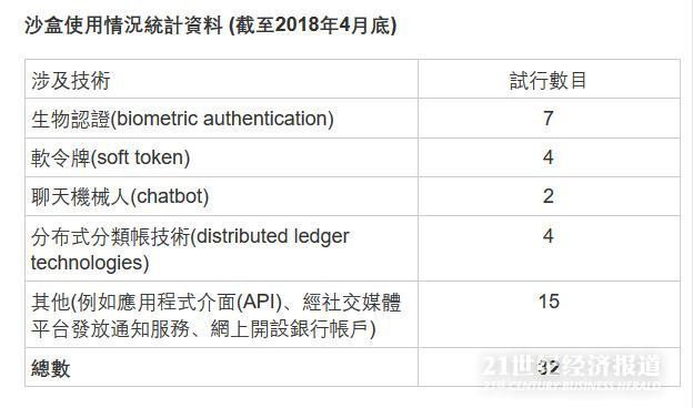 此前,2016年9月,香港金管局推出金融科技监管沙盒,让银行及其伙伴科技公司(科技公司)可在无需完全符合金管局监管规定的环境下,邀请有限数目的客户参与金融科技项目的试行。截至2018年4月底,共有32项新科技产品使用沙盒进行试行。其中22项试行业已完成,有关产品亦已于其后推出。此外,有18项试行是银行与科技公司合作进行。