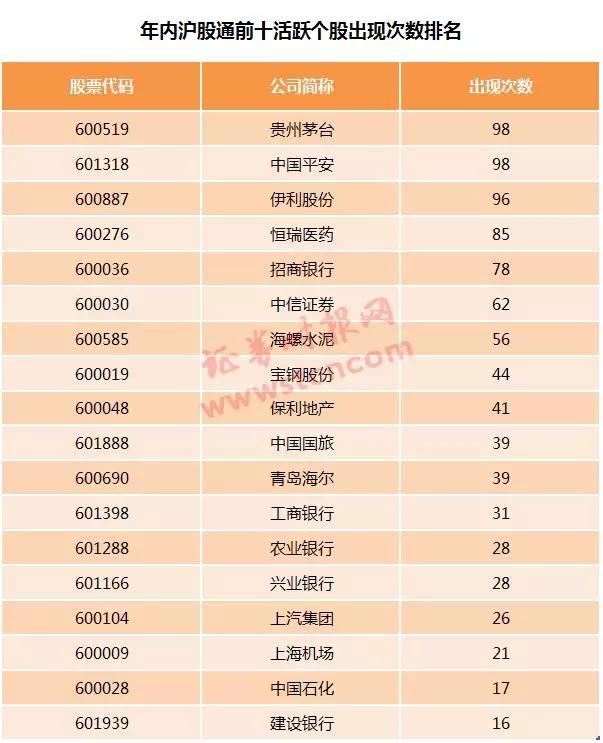 Wind统计数据显示,沪股通今年以来的98个交易日当中,贵州茅台、中国平安每天都出现在前十大活跃股名单当中,伊利股份出现96次、恒瑞医药出现85次紧随其后。