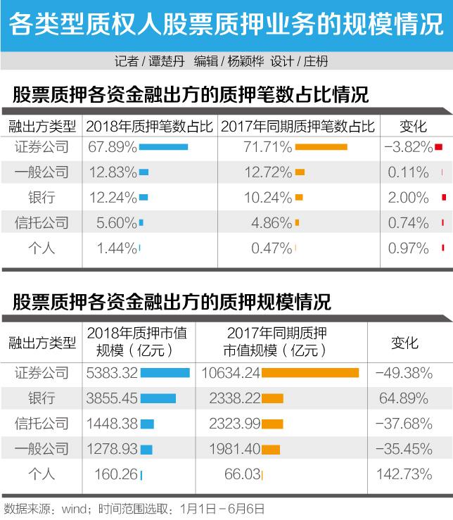 根据21世纪经济报道记者分析wind数据显示,截至6月6日,今年以来股票质押业务中质权人为券商的,质押规模较去年同期下滑49.38%;银行的质押规模则出现显著上升,增幅64.89%。