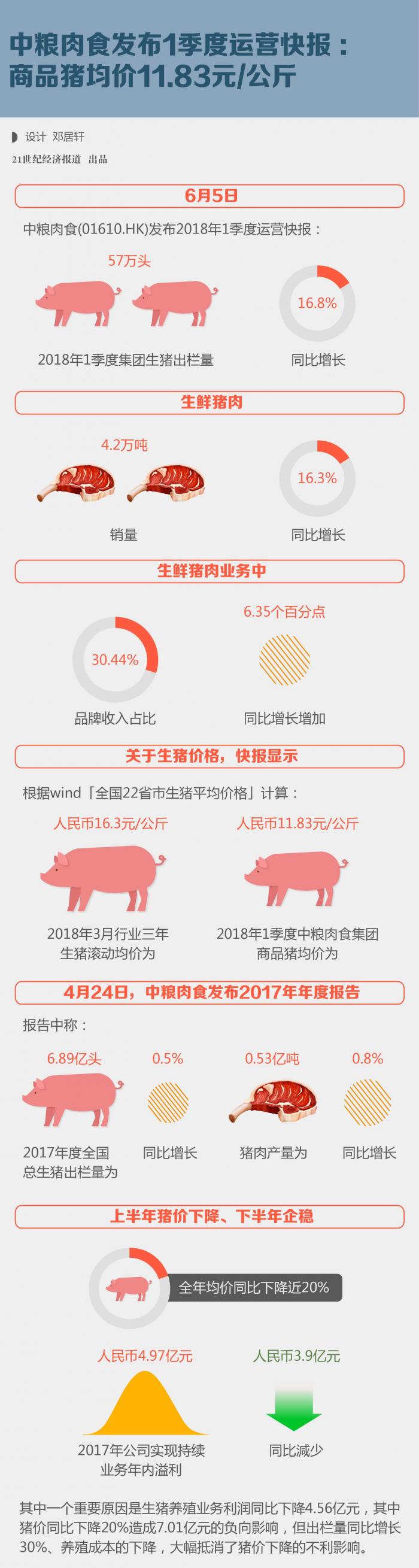 关于生猪价格,快报显示,根据wind「全国22省市生猪平均价格」计算,2018年3月行业三年生猪滚动均价为人民币16.3元/公斤,而2018年1季度中粮肉食集团商品猪均价为人民币11.83元/公斤。所谓行业三年生猪滚动均价,是指生猪某月份的行业三年生猪滚动均价,为包含该月份在内、向前推共计36个月范围内的wind「全国22省市生猪平均价格」计算的均价。