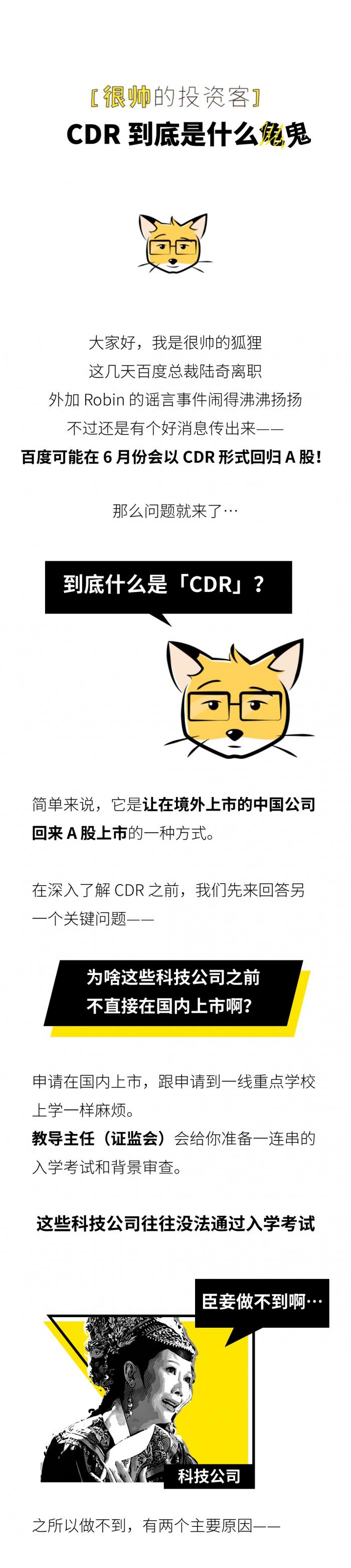 参考文章/ 《CDR深度报告:归来吧,浪迹天涯的独角兽》、《百度有望最快6月以CDR方式回归A股 或成首家试点公司》、《关于CDR,这些问题你想清楚了吗?》、《关于开展创新企业境内发行股票或存托凭证试点的若干意见》、《存托凭证发行与交易管理办法(征求意见稿)》、《中国证券登记结算有限责任公司存托凭证登记结算业务细则(公开征求意见稿)》