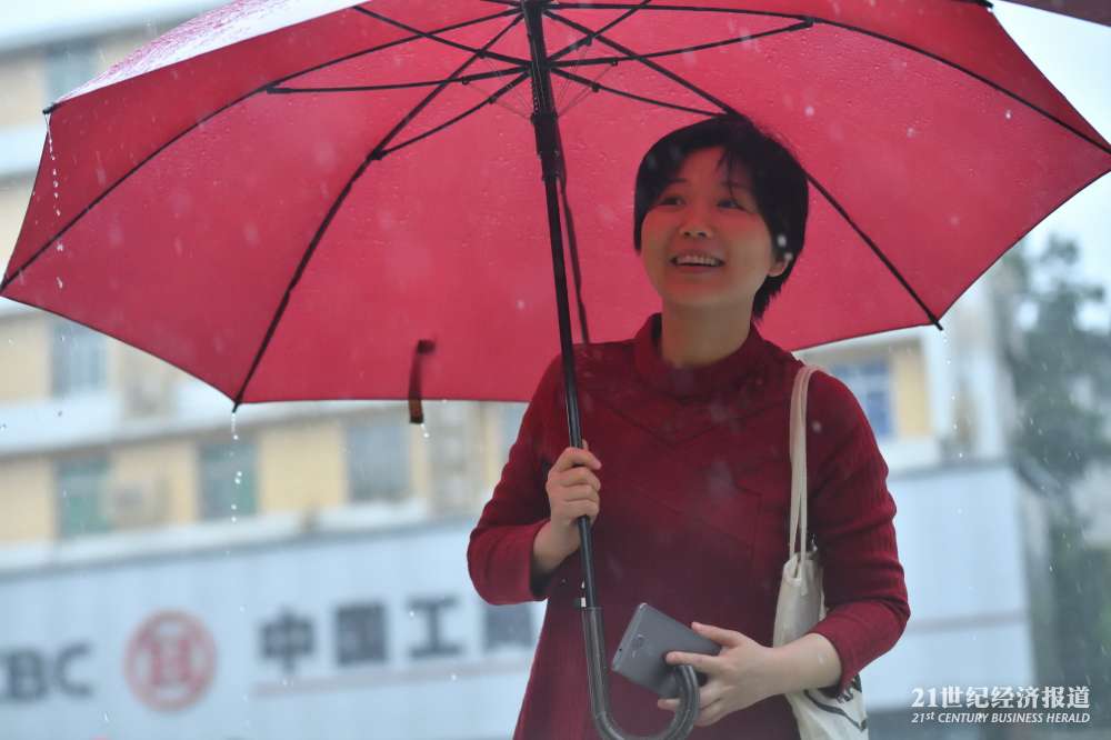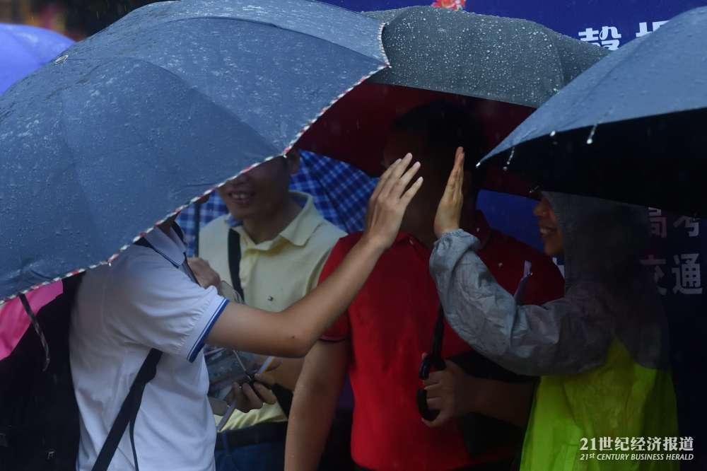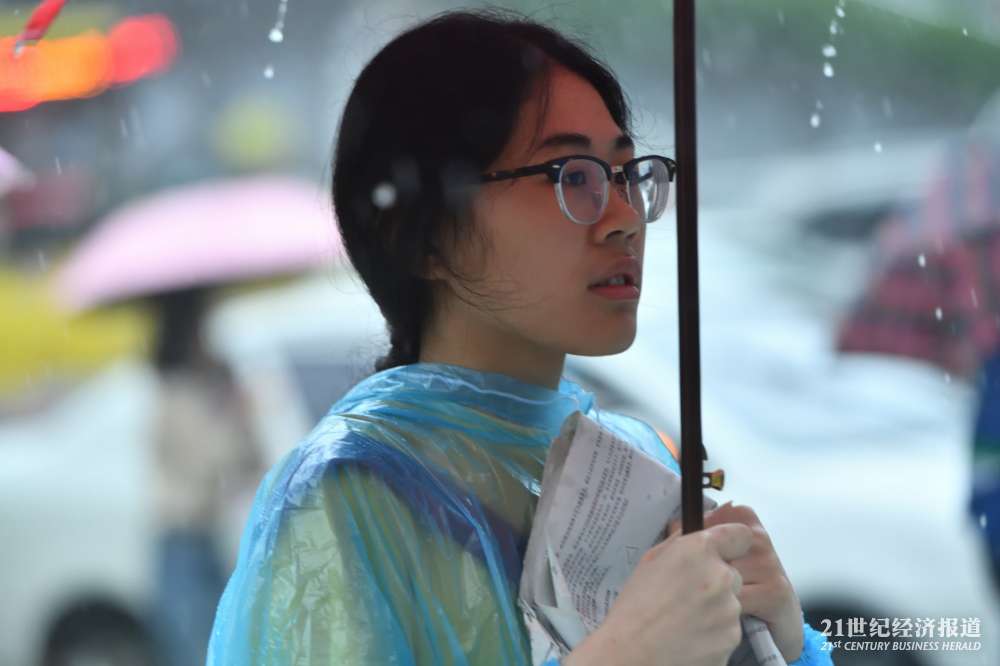 一位女考生(右)在雨中走脱了一只鞋子,捡在手里,准备重新穿上。