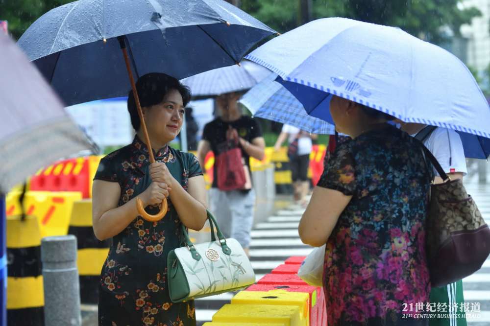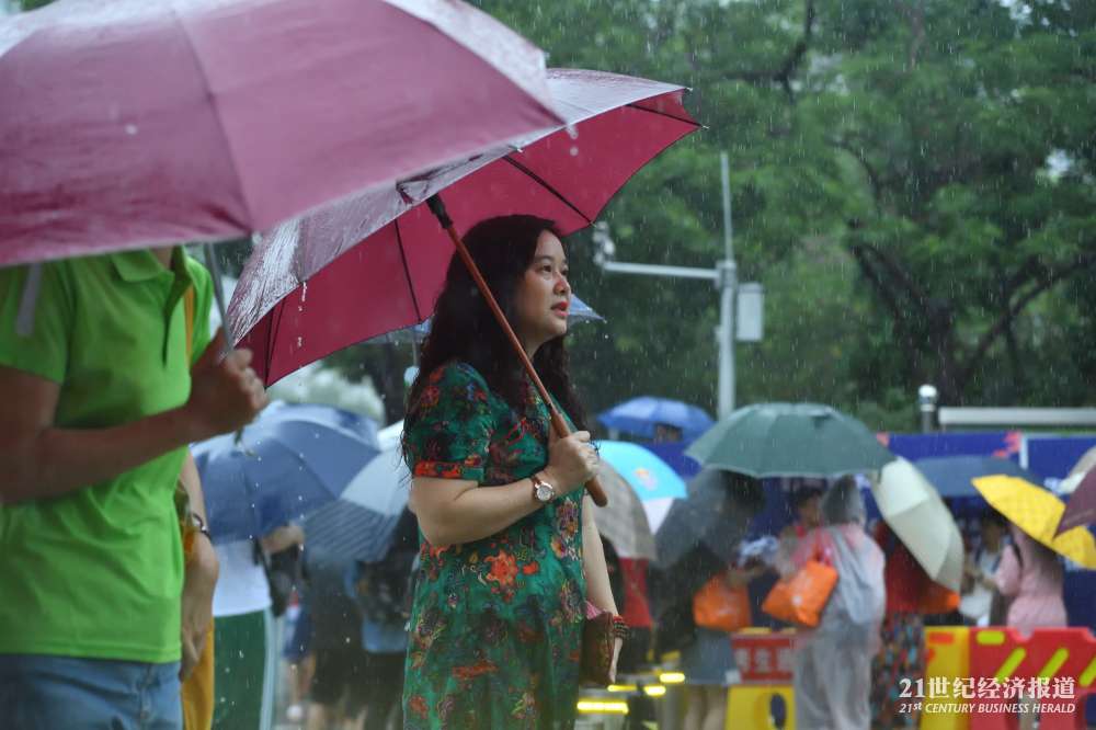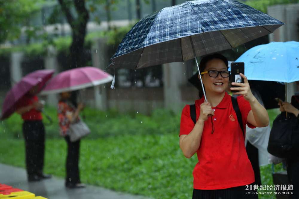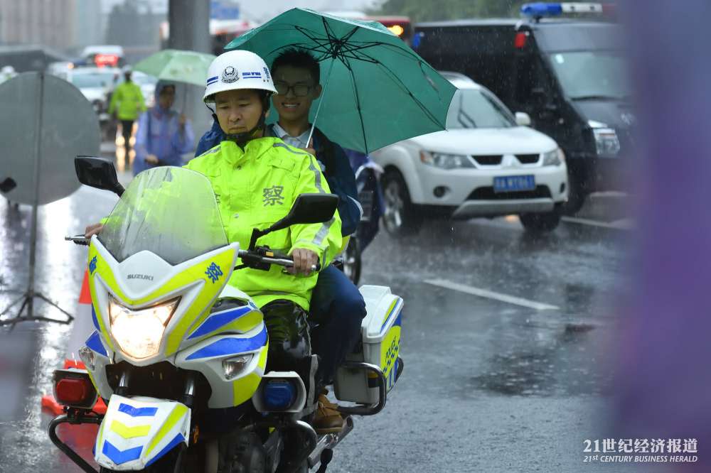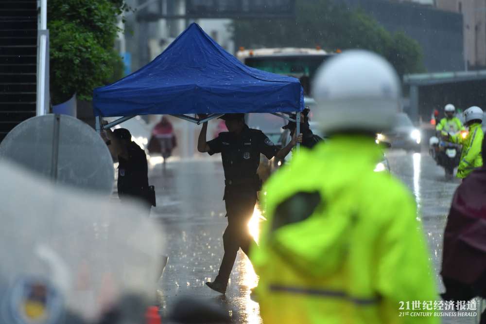 在雨中坚守岗位的特勤人员。高考期间,广州警方共部署了8000多名安保力量和1.2万多名防控力量,以全面加强各重点目标部位及高考点的巡防工作。