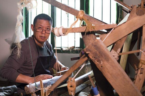 在织造车间里,木织机发出有节律的唧唧声,三四台织机的声音混杂在一起,让有些狭窄的空间变得热闹起来。无法想象当农忙过去后,所有的工人都回来开动织机,那又是怎样的一种场面。
