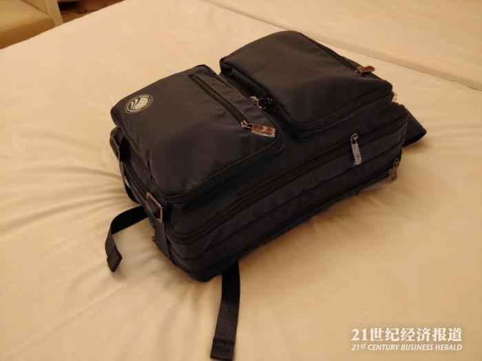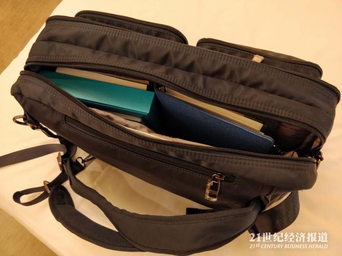沉甸甸的媒体包既可以双肩背,也可以斜跨。每个格子都被塞得满满。这里面有什么呢?