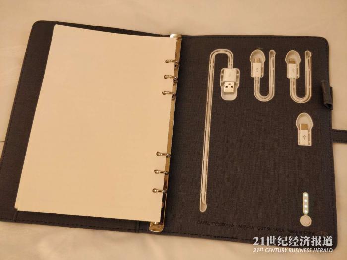 翻到封面,立刻有惊喜。右下角是一个电源,右上边有三个不同的插头,也就是说,这是一个藏在封皮里的充电宝!左边那个数据线应该就是给充电宝充电的。想法还是挺创新的,就是还没有试过能撑多久。