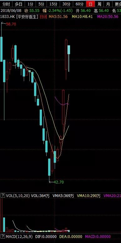 平安好医生为今年5月4日在港股上市的独角兽新股,发行价为54.8港币/股,发行数量为1.6亿股。上市之后股价走势低迷,一路下行并在5月30日最低跌至42.7元(港币),而后6月初股价快速回升,最新收盘价为55.55元,短短几天较最低价回升30%。最新市值为593亿元(港币),折合人民币为484亿元。