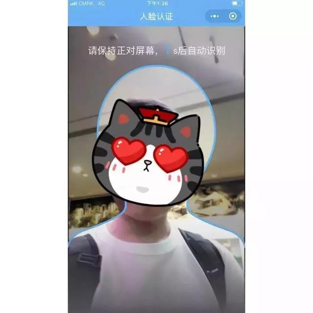进入下一步,则是「人脸验证」的环节,小程序自动调取相机,用户脸部正对屏幕,3秒内即可自动识别。