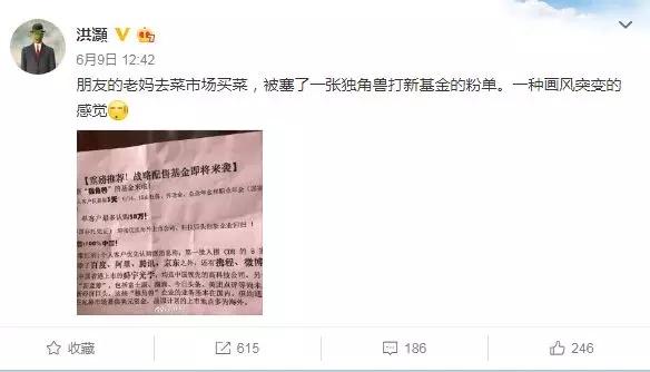交银国际董事总经理洪灏在微博上透露,朋友的母亲去菜市场买菜,也被塞了一张独角兽打新基金的粉单。