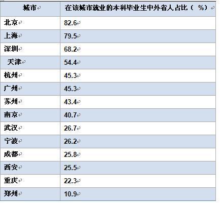比如在该城市就业本科毕业生中外省人占比最高的是北京,为82.6%,其次为上海,为79.5%,深圳比例为68.2%,天津为54.4%,杭州和广州均为45.3%。苏州和南京分别为43.4%、40.7%。但是 武汉、 宁波、成都、西安、重庆比例只有20%左右,郑州为10%左右。