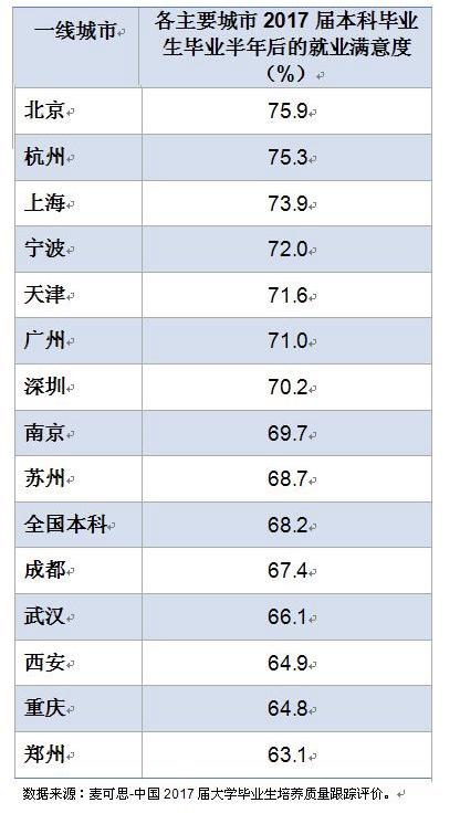 从满意度看,北京、上海、杭州、宁波、天津、广州、深圳是2017年届本科毕业生毕业半年后就业满意度最高的城市,比例分别为70%以上,南京、苏州等城市比例为六成左右。可以看出,杭州的大学生毕业就业满意度已经超过了深圳和广州。