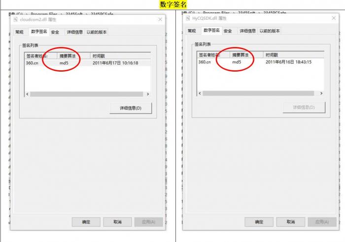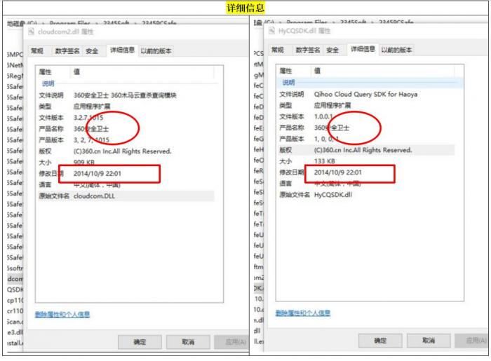 值得注意是,2345安全卫士1.0版本在2014年发布,这个版本目前仍可在网上下载使用。这个版本的“cloudcom2.dll”和“HyCQSDK.dll”两个文件的数字签名中,签名者姓名却是“360.cn”。这两个文件的“详细信息”中,产品名称为“360安全卫士”。两者的版权信息显示,版权归属于360.cn。