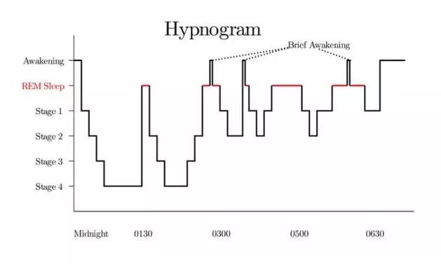 图中,横坐标表示持续时间,纵坐标表示睡眠深度,越往下睡眠越深。标红的地方属于REM,stage 1-2 属于浅度睡眠,stage 3-4 属于深度睡眠。