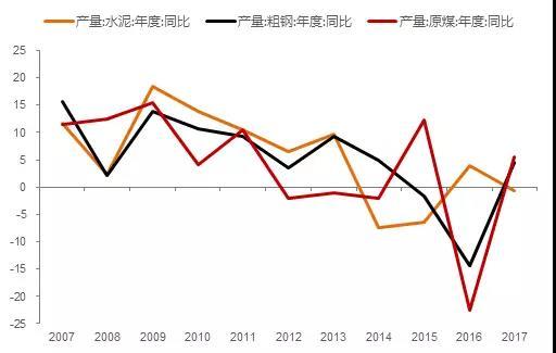 如下面这张图反映了钢材、水泥、煤炭的产量都接近于零增长,甚至负增长。