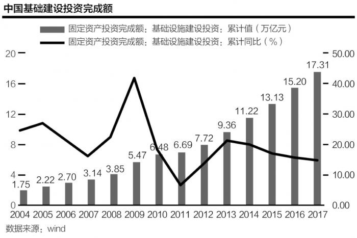 改革开放以来,我国基础设施建设取得了举世瞩目的成就,我国基建投资最近三年的复合年均增长率(CAGR)为17.5%,基建投资对全部固定资产投资增长的贡献率约为60%。2017年,我国基建投资完成额17.3万亿元,同比增长14.9%。