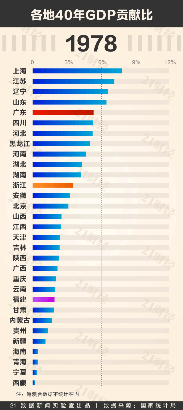 据21数据新闻实验室统计,在1978年到2017年的40年间,广东、福建、浙江经济增长都超过了400倍,经济贡献比逐年增长。
