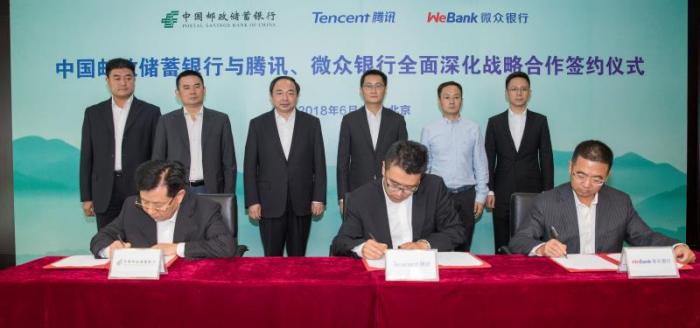 在腾讯、微众银行与邮储银行的签约现场,马化腾,邮储银行党委书记、董事长李国华出席并见证签约。邮储银行副行长曲家文,腾讯公司支付基础平台与金融应用线副总裁、金融政策办公室主任马晓东,微众银行监事长万军分别代表三方签署了《全面深化战略合作协议》。
