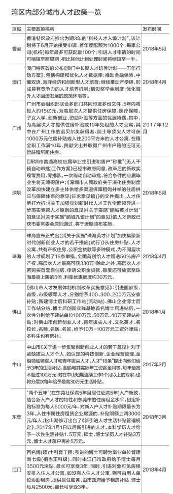 作为我国未来区域发展中最具增长活力和创新动力的重要区域之一,集聚优质、充足的人力资源,聚集国际高端人才,是粤港澳大湾区持续发展的必然要求。据南都记者梳理统计,截至目前,湾区12个城市中就有9个在今年推出了力度空前的人才引进政策。