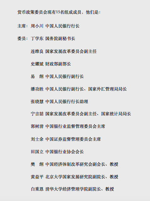 据《中国人民银行货币政策委员会条例》(下称“条例”),货币政策委员会由下列单位的人员组成:中国人民银行行长;中国人民银行副行长二人;国家计划委员会副主任一人;国家经济贸易委员会副主任一人;财政部副部长一人;国家外汇管理局局长;中国证券监督管理委员会主席;国有独资商业银行行长二人;金融专家一人。2010年金融专家拓展为三人。