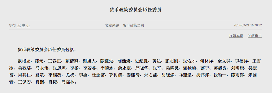 据央行官网,2017年3月的货币政策委员会有15名组成成员,名单如下: