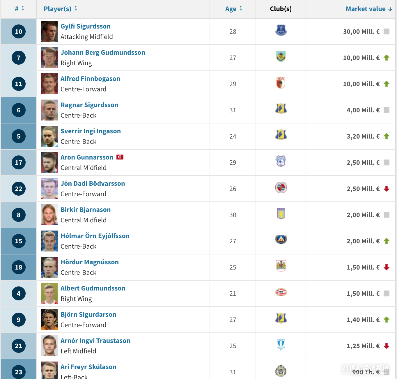 冰岛在世界杯上的亮相并非是个偶然。在英国Telegraph统计的世界杯32个球队球员在转会市场上的价值表显示,冰岛的球员转会费总额大约为6690万英镑,排在第24位,介于韩国与日本之间。而转会费中有2640万英镑,来自人称“冰岛大狙”的西古德森,其现效力于英超埃弗顿俱乐部,另据transfermarkt网站数据,西古德森的转会费现在大约为3000万英镑。
