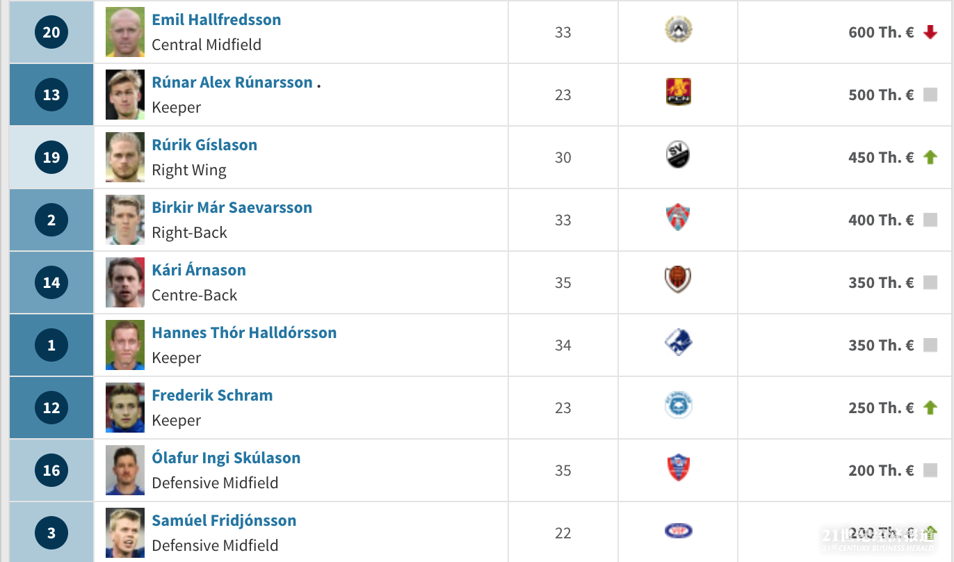 根据统计数据,目前冰岛的23人员名单中,仅有三名球员是在冰岛本国效力,其余球员均是职业球员。首发11人的名单中更是有2人来自英超、1人来自于意甲、1人来自德甲。