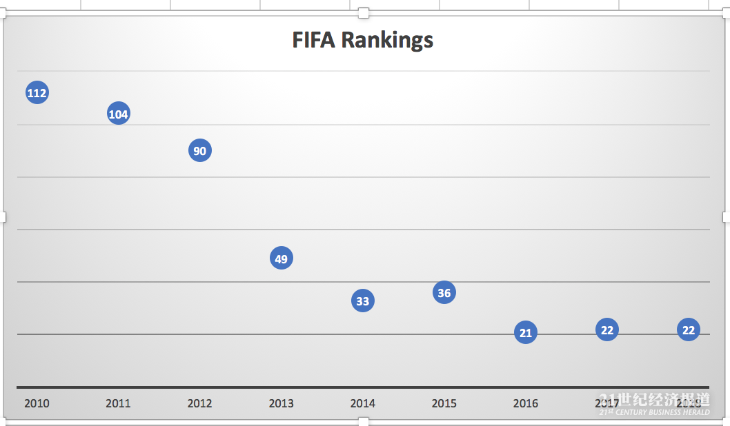 在冰岛的多年努力下,冰岛足球队的水平也不断提升。在国际足球联合会(FIFA)的公布的国家队排名中,冰岛从2010年时的112名一路上升,2018年的排名在22位。这也让冰岛成为本届世界杯中或是最难预料的一匹黑马。
