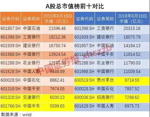 不管点位如何变化,占据A股市值前十的总是铁打的两桶油和金融股。除了交通银行、中国中车掉榜,贵州茅台、招商银行取而代之之外,其余八股稳坐“钓鱼台”。