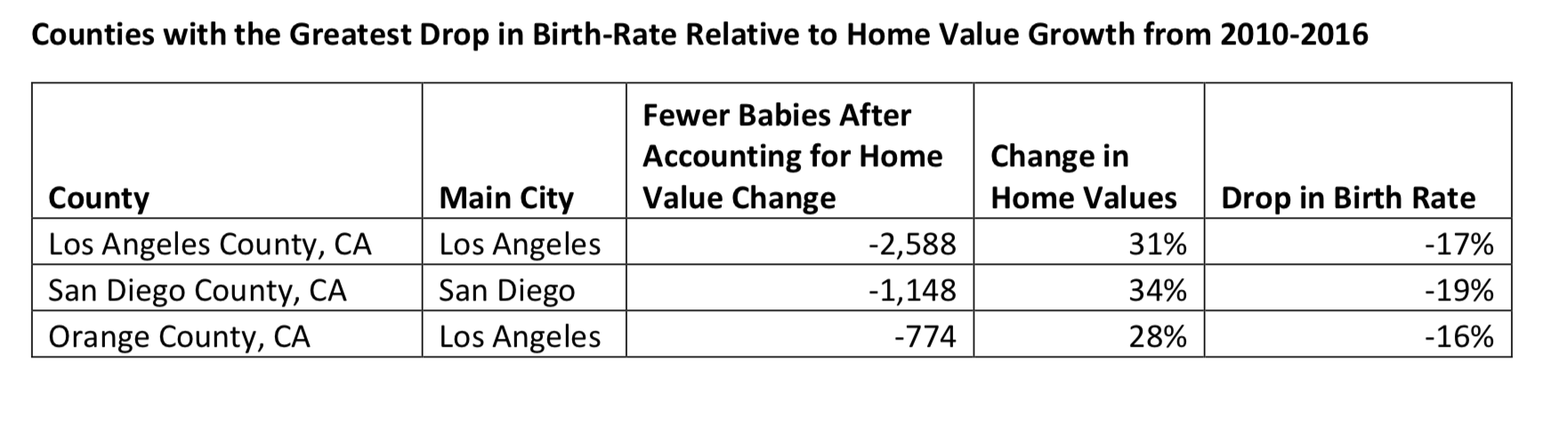 报告称,房价涨得最快的地区,生育率下降也最快。这个趋势在房价特别高企的区域尤为显著,例如加利佛尼亚州,还有德克萨斯州的奥斯汀、纽约的布鲁克林以及西雅图。房价上升10个百分点,年龄在25- 29岁的女性生育率就降低1.5个百分点。房价飞涨可能让家庭推迟生育时间 — 大部分夫妇希望在做父母之前拥有稳定的经济状况。