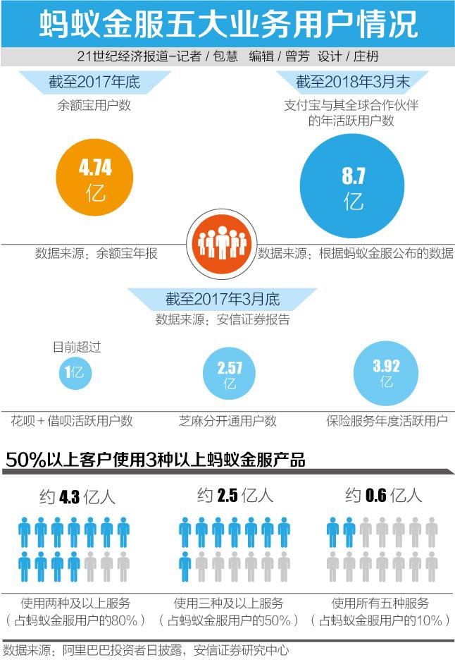 巴克莱报告称,根据蚂蚁金服管理层透露,截至2017年3月,大约有六千万用户使用了蚂蚁的全部五项功能(支付、财富管理、融资、保险和芝麻信用)。巴克莱预计到2018年3月这个数据将超过1亿。