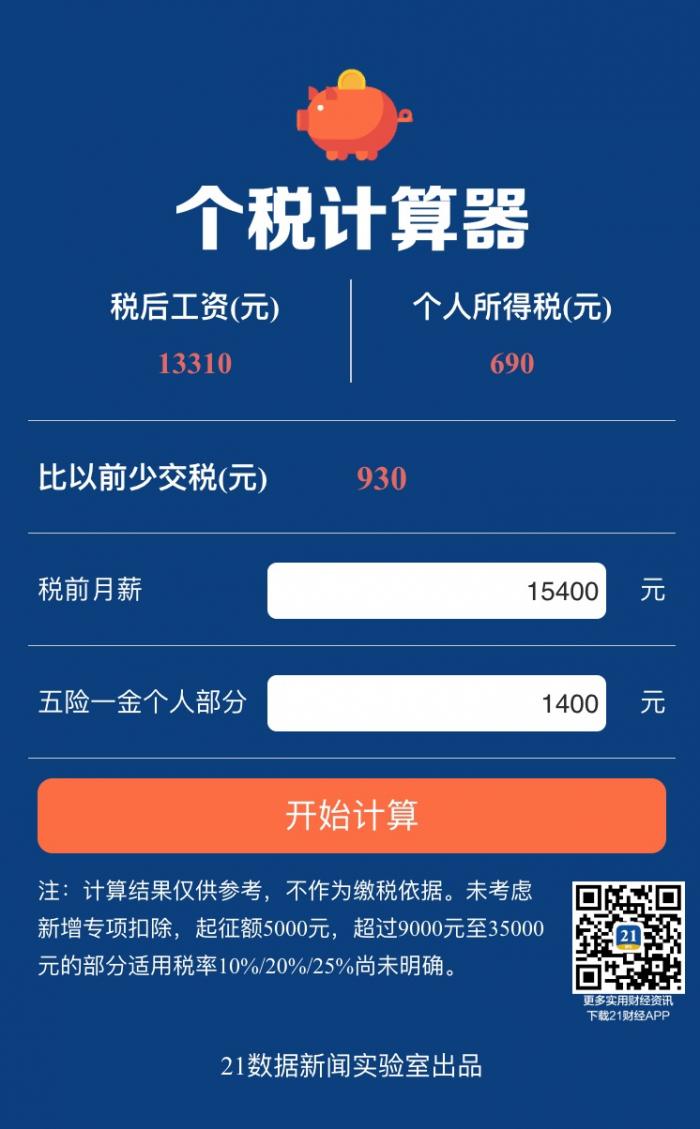 据21数据新闻实验室统计,不考虑专项附加扣除,如果税前平均月薪是16000元,五险一金个人部分扣除1600,那么拿到手至少13610元,调整后个税最多790元,相比调整前至少少交930元。