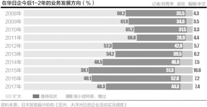 在华日企的业务发展意向与日本对华投资的实际情况有很强的正相关性。据中国商务部数据,2017年,日本对华投资32.7亿美元,同比增长5.1%,扭转了连续4年的下降趋势。更值得一提的是,日企对中国市场的信心也在逐步恢复。JETRO的“亚洲、大洋洲日资企业实况调查”显示,预计2017年可以在华盈利的日企超过七成,同比增长了5.9个百分点。