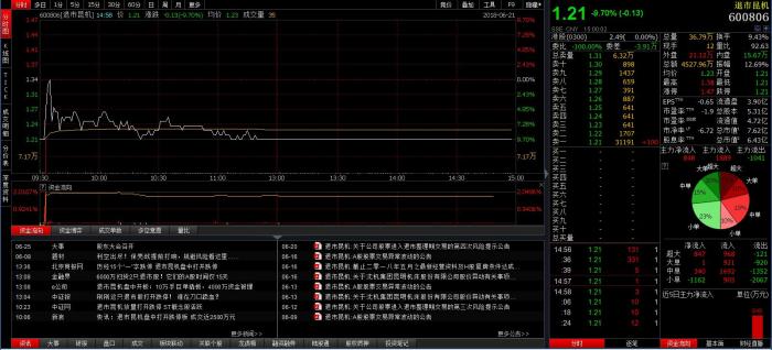 6月21日,退市昆机在继续以跌停开盘后,在上午9点33分左右终于被约10万手巨单撬开跌停,股价扶摇直上一度翻红,但随后又快速回落,至午间收盘再度跌停并维持至收盘。截至当日收盘,退市昆机跌幅9.7%,报收1.21元/股。