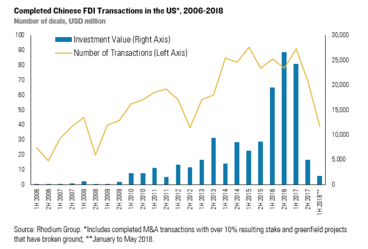 中国赴美FDI去年上半年超250亿美元,今年迄今只有18亿美元,再算上今年退出的投资,净投资为负。