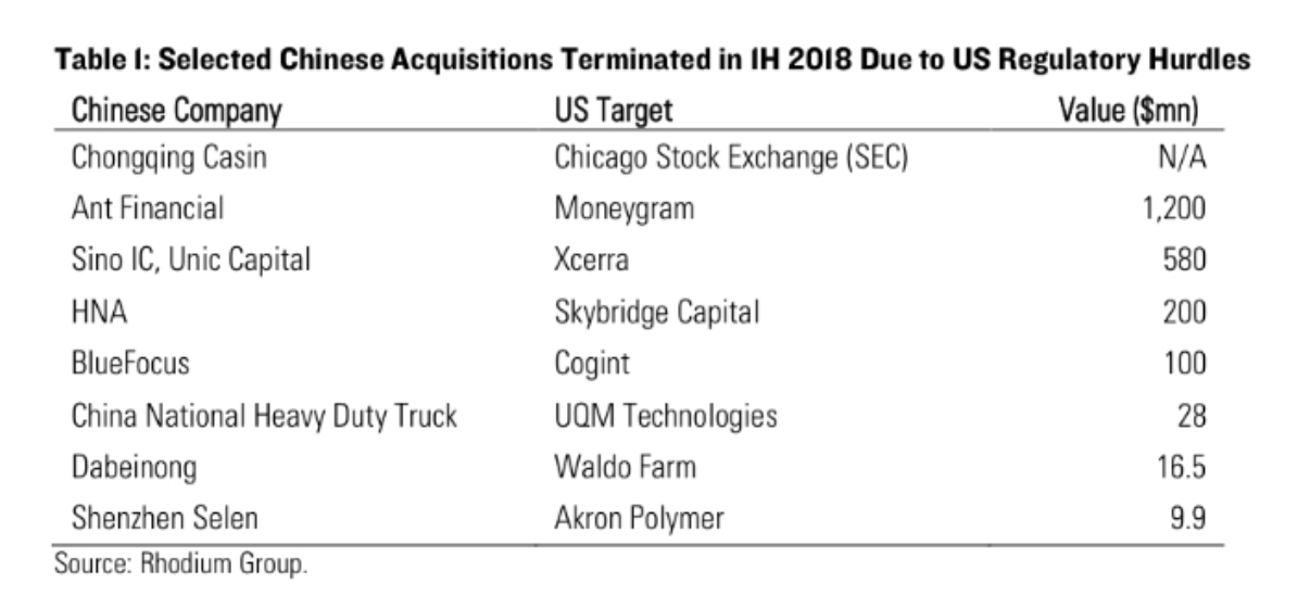 至于数字暴跌背后的原因,荣鼎指出这包括两方面,一方面是美国对外商投资的审查趋紧,目前美国国会正在寻求加强CFIUS( 美国外资投资委员会)的国家安全审查,另外荣鼎还指出,6月末,白宫还有可能宣布基于301调查的新的投资限制。报告还显示,今年前5个月,美国CFIUS等监管部门已经阻拦了价值20亿美元的中国并购交易。
