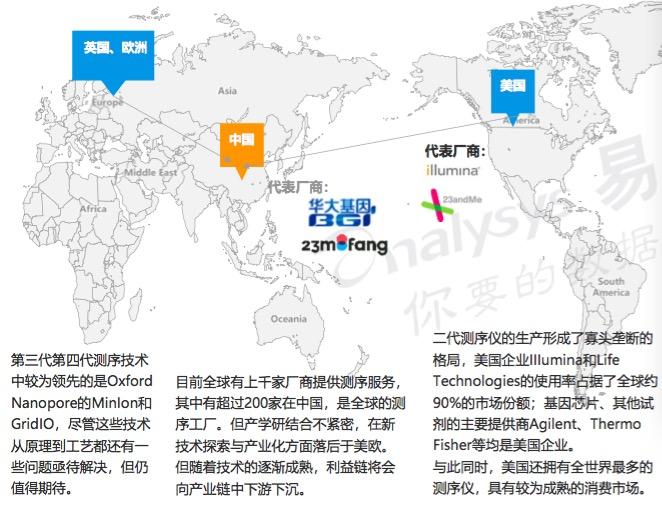 如上游方面,技术及设备供应商,二代测序技术基本由美国垄断,英国在新技术上暂时领先,中国也在自主研发新的测序技术和设备,但整体上不占优势。
