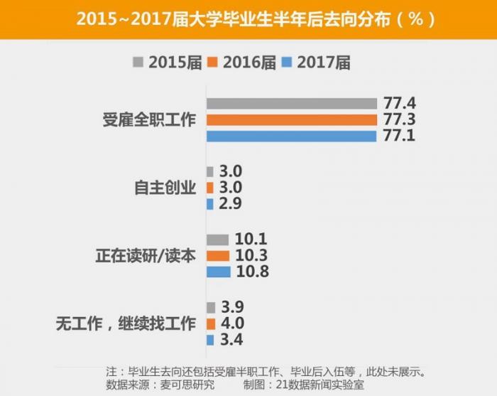 麦可思数据显示,大部分毕业生会选择直接就业(全职),占比接近8成;而另外有1成的人选择继续深造;当然,也有少数人选择自主创业或者继续找工作。