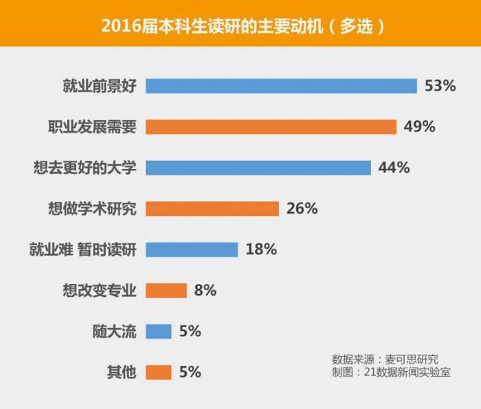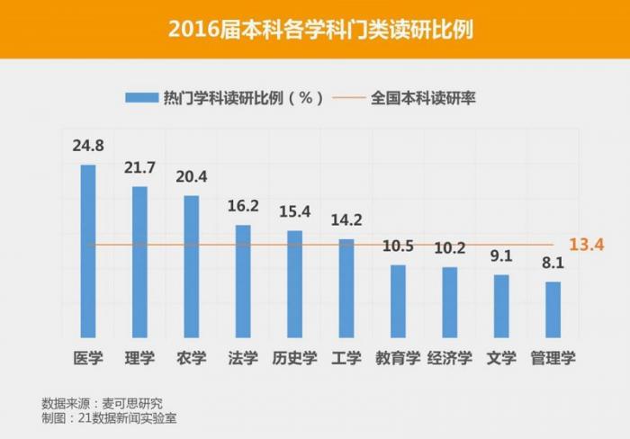 数据显示,2016届本科生中,医学、理学、农学、法学、历史学、工学等专业读研的比例较高——在14%以上,高于全国本科平均读研率。说到读研的主要动机,因为“就业前景”“职业发展需要”而读研的占比最高。