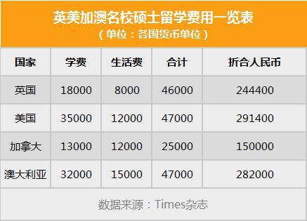 近期,TIMES发布全球留学费用排行榜,以较为热门的留学目的地——英美澳加为例做了留学这四国的名校硕士的留学基本费用,可以看出,这笔费用不菲,平均每年24万元。这四国中,最便宜的是加拿大,总费用15万左右;另外,英国24.4万,美国29.14万,澳大利亚28.2万。