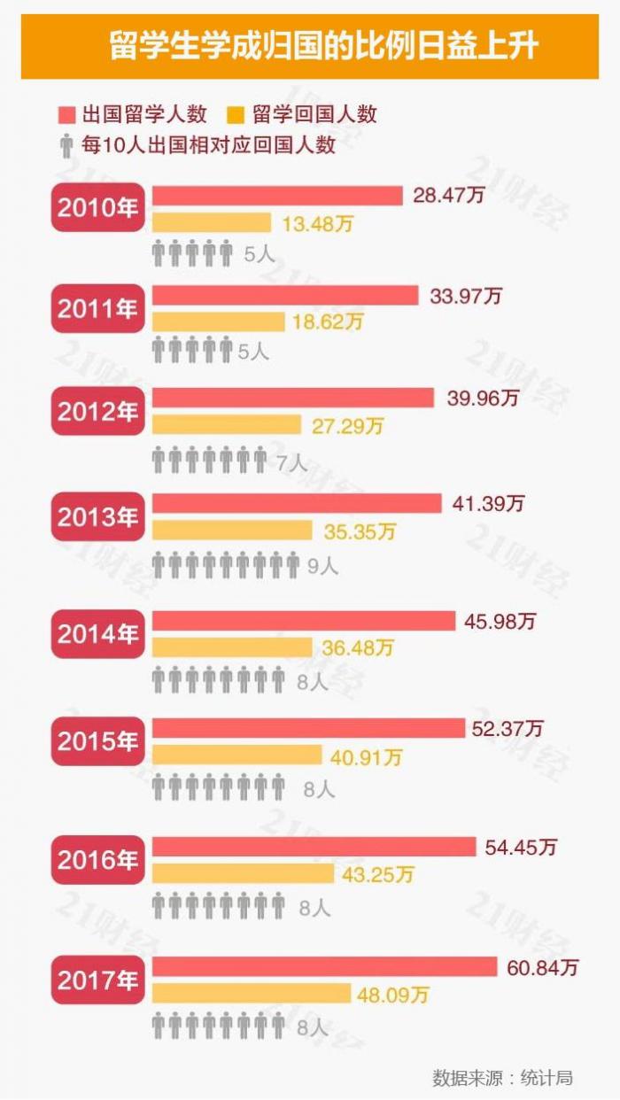 近年来,越来越多人选择出国留学深造,譬如2017年,我国出国留学人数突破了60万大关,2007年才14.4万人。另一方面,“海归”人数增长更加强劲:21世纪初,每100名出国留学生大约只有十几人学成回国,而到了2017年,每100名出国留学生有近80人回国发展。