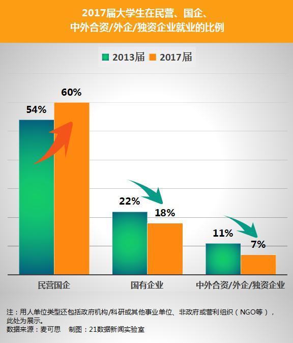 数据显示,半数以上的毕业生选择到民营企业就职,而且呈增长趋势,譬如2013届的比例为54%,2017届上升至60%。其次是国有企业,占比20%左右。在中外合资/外资/独资企业就业的比例最少,从2013届的11%降至2017届的7%。