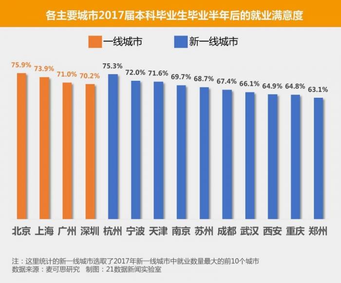 从满意度看,北京、上海、杭州、宁波、天津、广州、深圳是2017年届本科毕业生毕业半年后就业满意度最高的城市,比例均为70%以上。