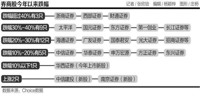 根据记者统计,今年以来,在30只下跌个股中,跌幅超过10%的有29只。其中,跌幅超过30%的有12只券商个股,超过20%的有24只个股。29只下跌个股的跌幅已经达到了27.74%。
