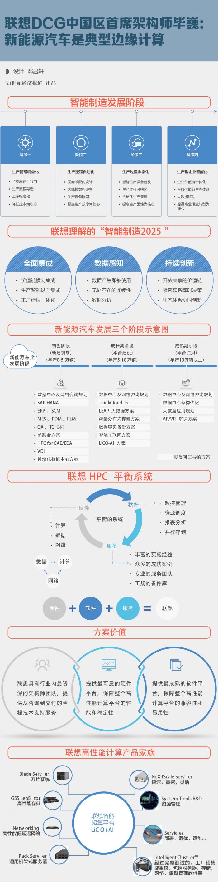 值得注意的是,有别于传统汽车,新能源汽车正呈现出新的特点。“新能源汽车使用电力驱动,整个结构由过去的燃油发动机变为电池+电动机,从而大大简化了车体,”近日,在接受21世纪经济报道记者采访时,联想数据中心业务集团(DCG)中国区首席架构师毕巍表示,“与此同时,汽车内IT、电子化部分得以加强,它是一个典型的边缘计算设备。”