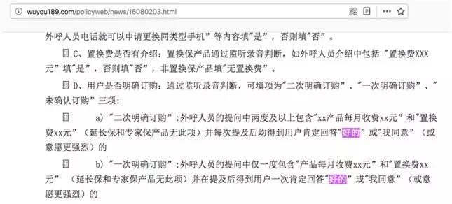 另外,令记者颇感纳闷的是,前述电话营销人员在与丈母娘沟通时,并未对相关收费环节做出清晰的二次确认。相反,只要是涉及到费用的内容,她都会用很快的语速一带而过。在电话中,营销人员多次反复强调“免费换机”一类的内容,甚至用这些内容来引诱营销对象说出“好的”这样的关键字眼。