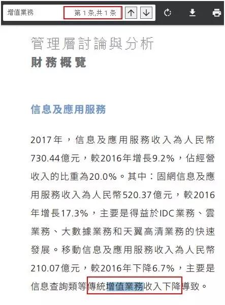 下图为中国电信2017年报截图,全文仅有一处涉及“增值业务”(繁体汉字)。