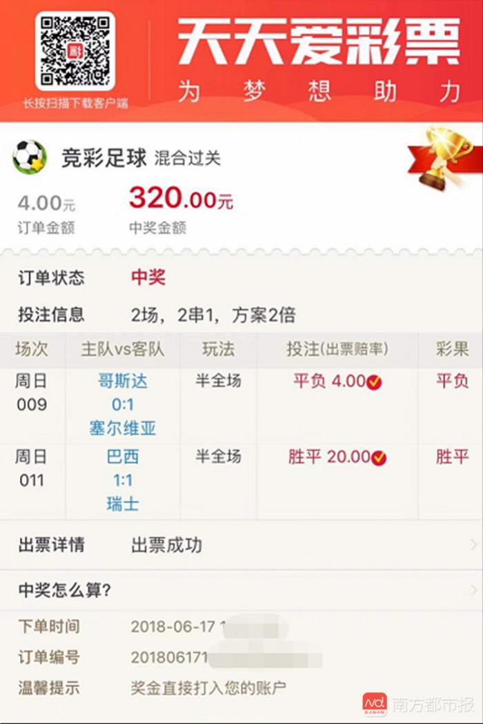 今年的俄罗斯世界杯,他通过以小博大,已经赚了好几顿喝酒钱。6月17日,他在一款名为“天天爱彩票”的App上下注一场哥斯达vs塞尔维亚的世界杯比赛,用4元买入半全场平负局,最终获得320元的进账,最高赔率近80倍。