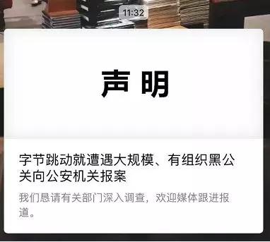 值得注意的是,在腾讯发布上述早间公告1小时后,今日头条微信公众号也发布声明表示,已就“黑公关”一事向公安机关报案。该声明称: